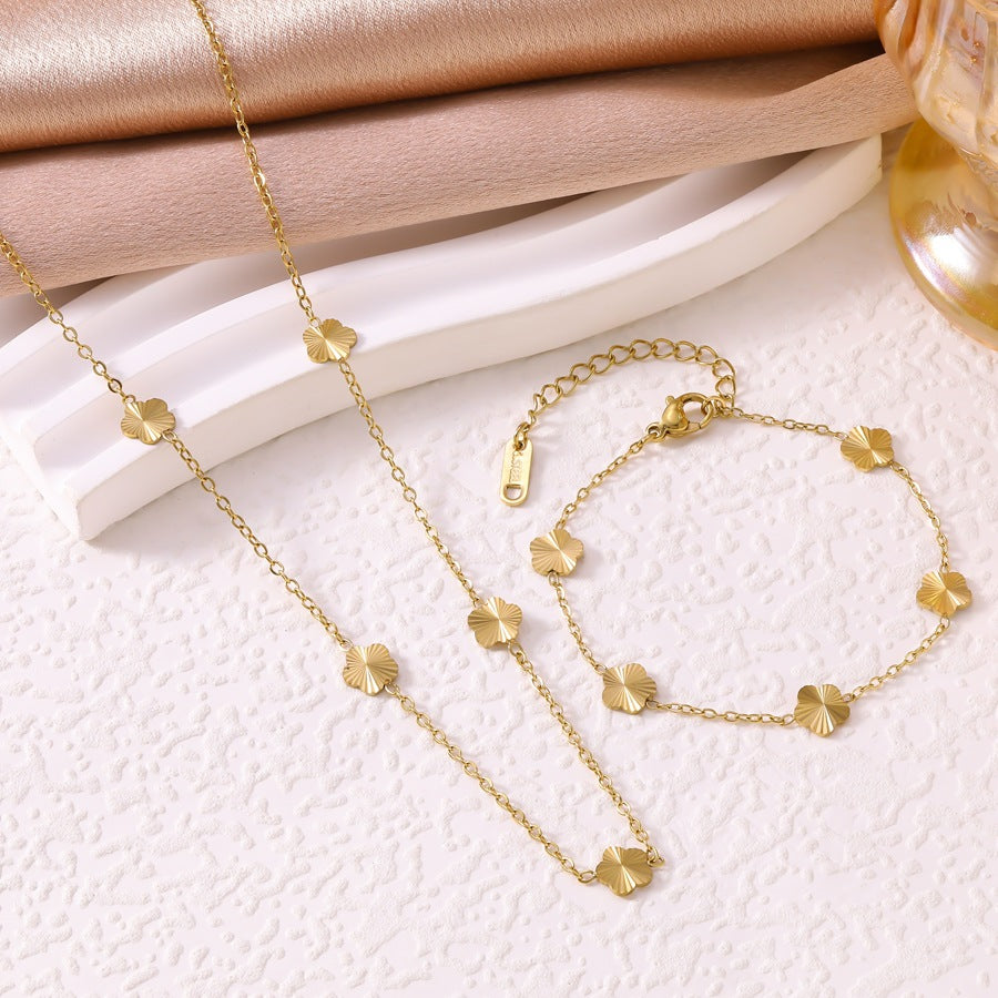Wholesale All-Titanium Steel Light Luxury Fashion 18K Gold Engraved Five-Leaf Flower Mini Bracelet Necklace for Women