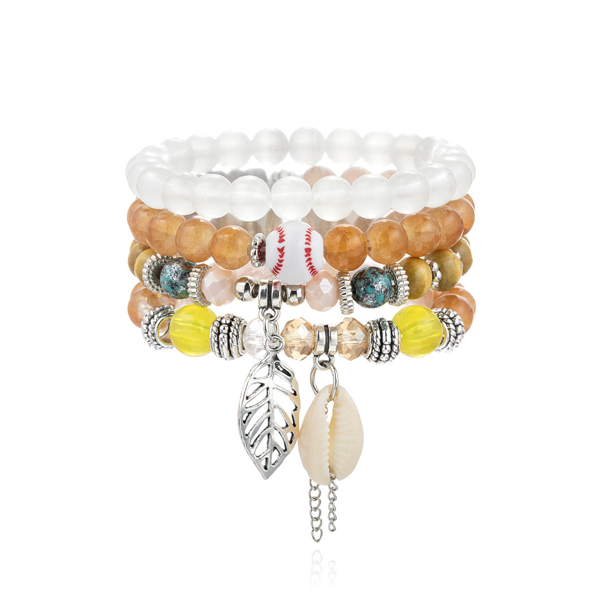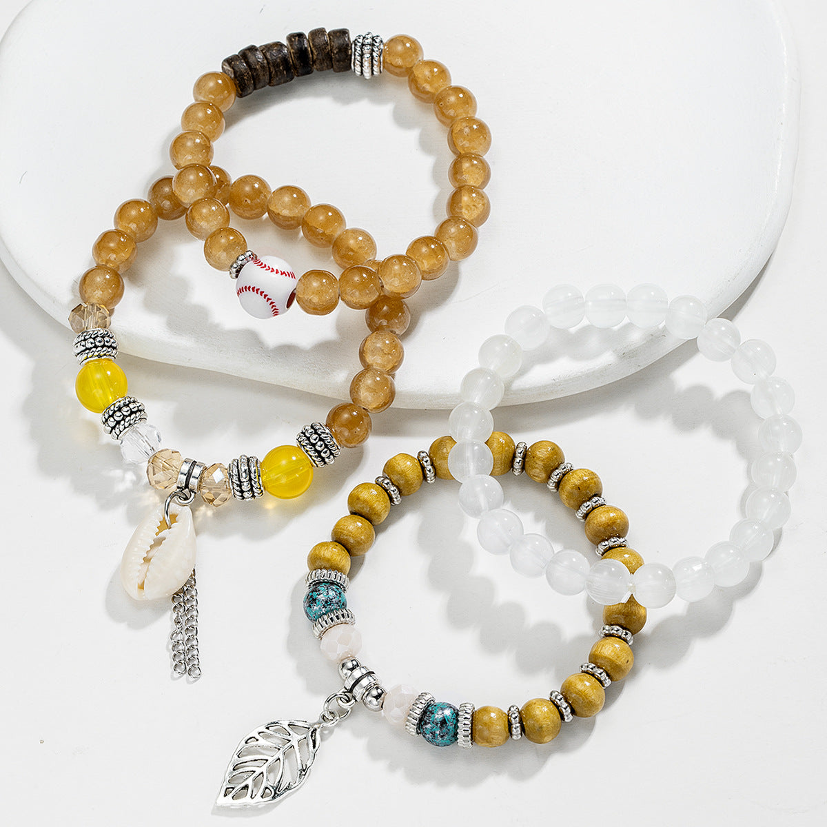 Wholesale Ocean-themed seashell, leaf, and wooden bead elastic rope bracelet