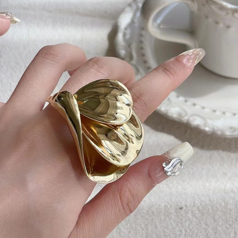 - Gold double ring multi-layered petal ring