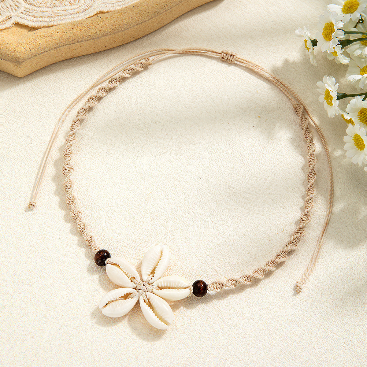 Wholesale Bohemian shell woven flower wooden beads rope adjustable women's necklace