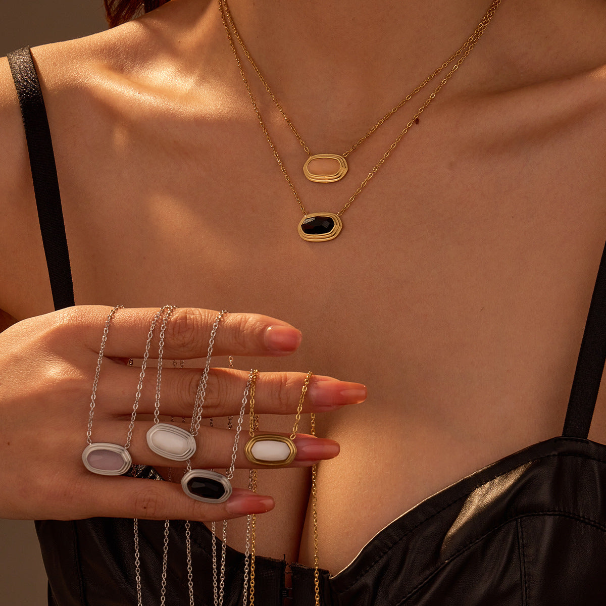 Wholesale geometric black agate inlaid necklace pendant stainless steel 18K gold plated clavicle chain
