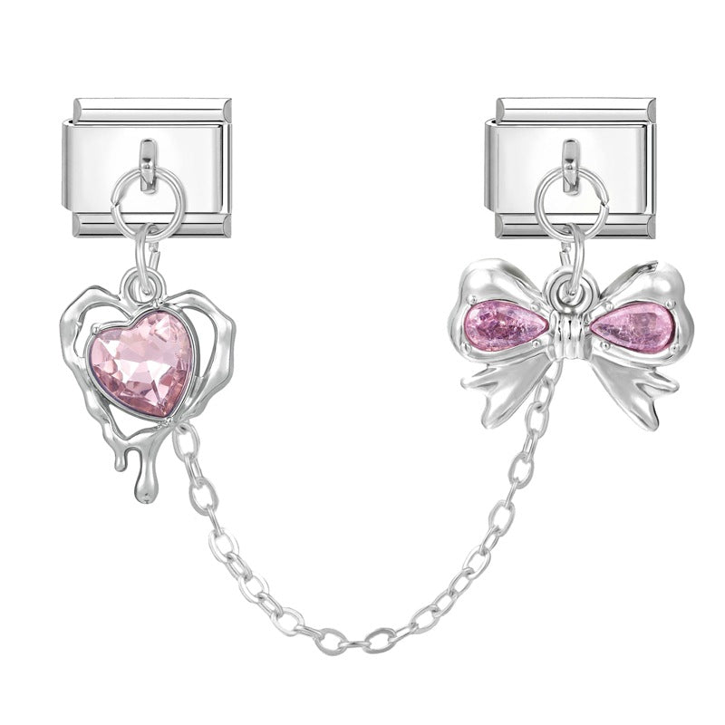 - Steel double hanging-pink heart + bow 2PCS