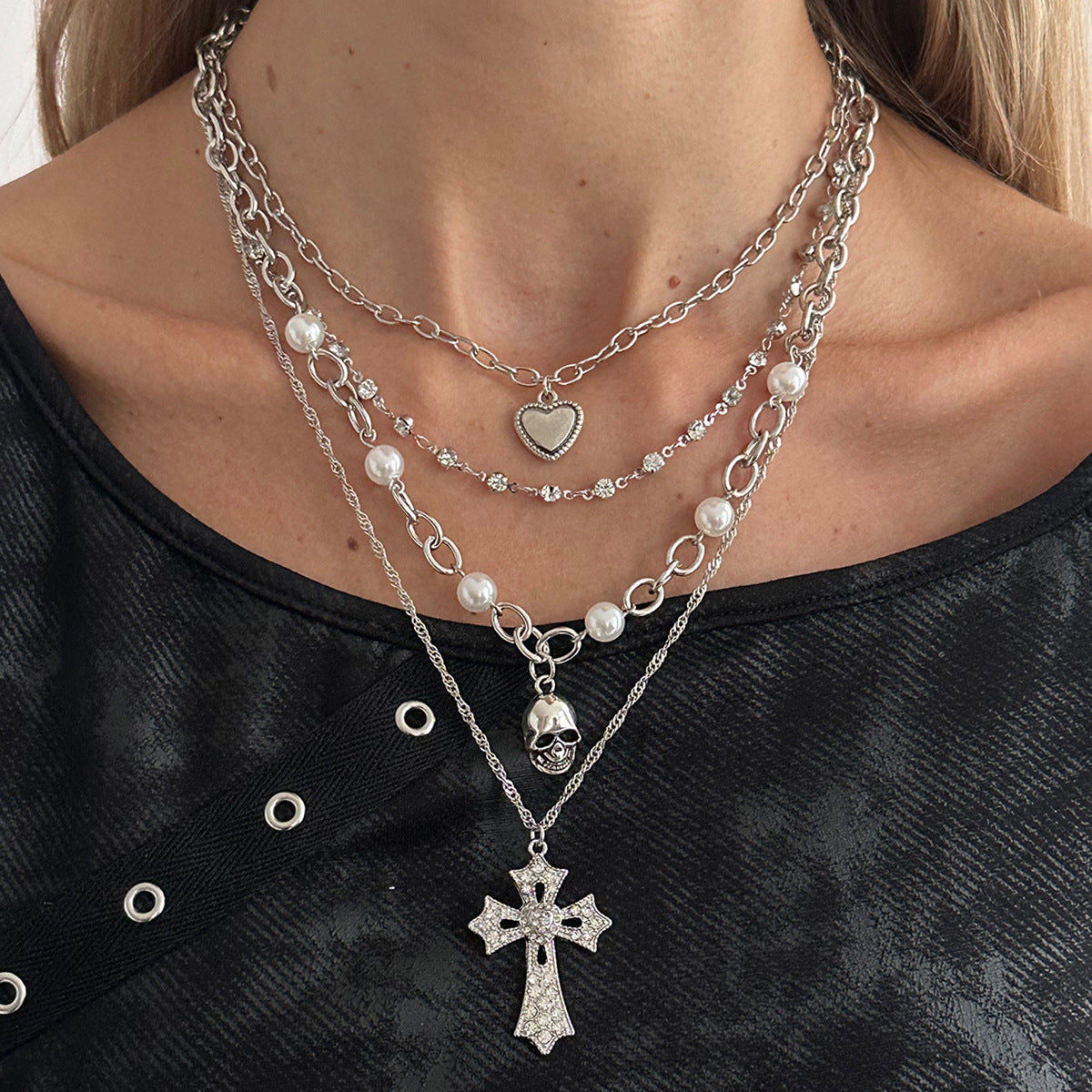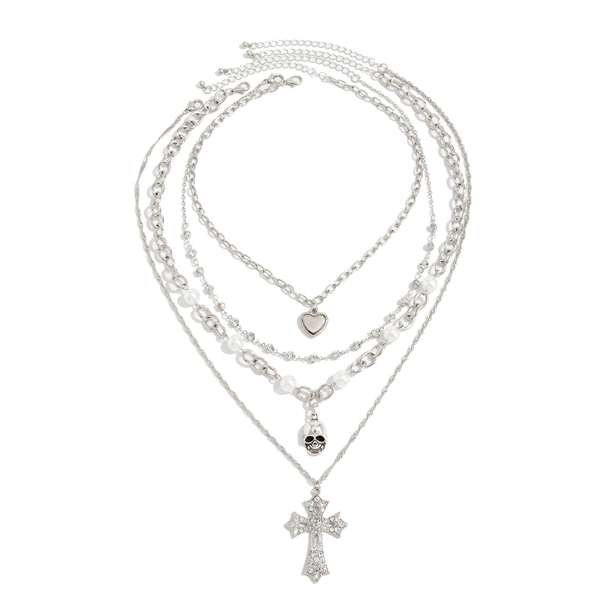 Wholesale Diamond Cross Stacked Clavicle Heart Skull Pendant Necklace