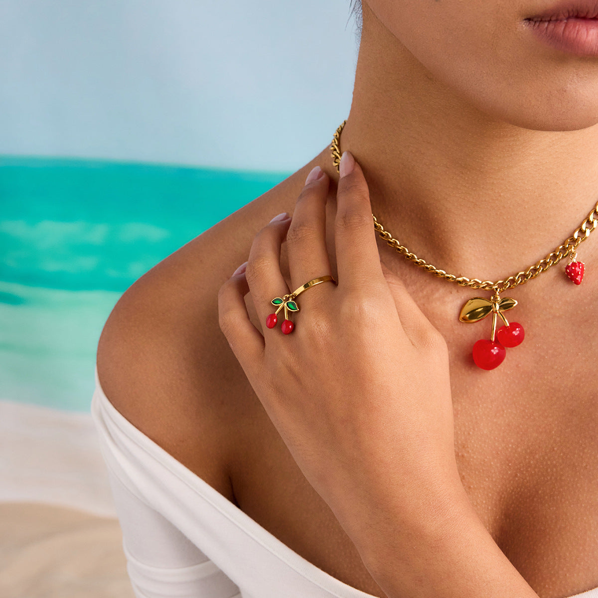 Wholesale 18K Gold Stainless Steel Oil-Dropping Cherry Pendant Adjustable Open Ring