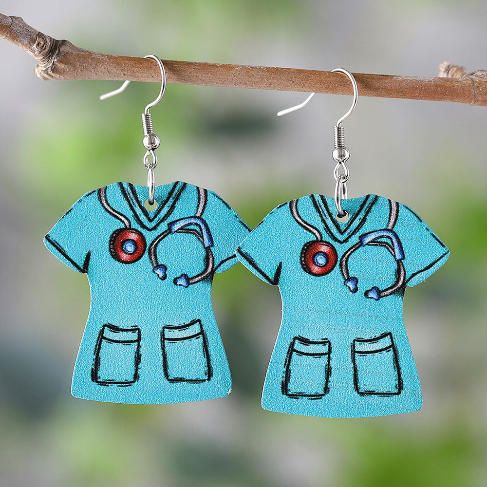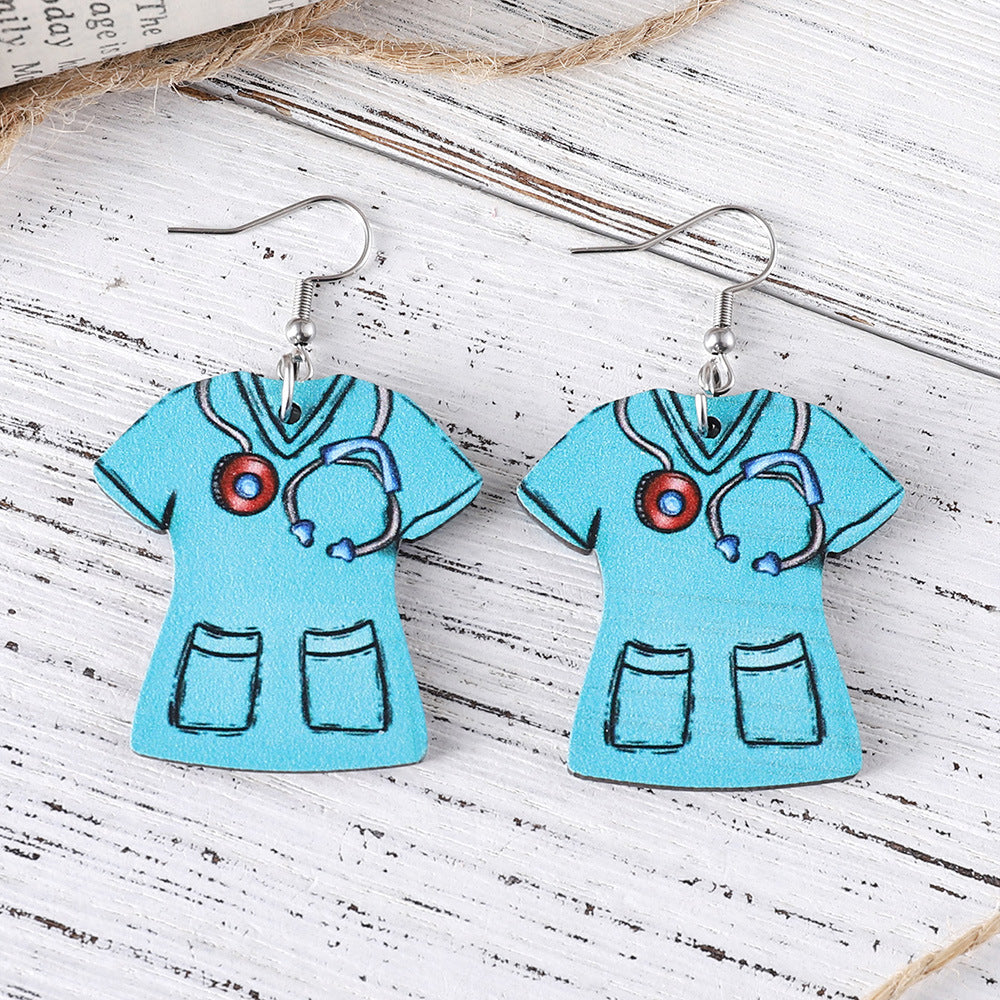 Wholesale Nurses' Day Earrings: Double-Sided Wooden Design Featuring Nurse Uniform and Stethoscope Pendants