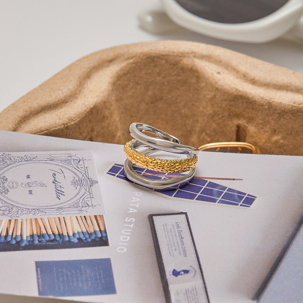 Wholesale 18K gold and stainless steel gold and silver three-layer hollow open ring