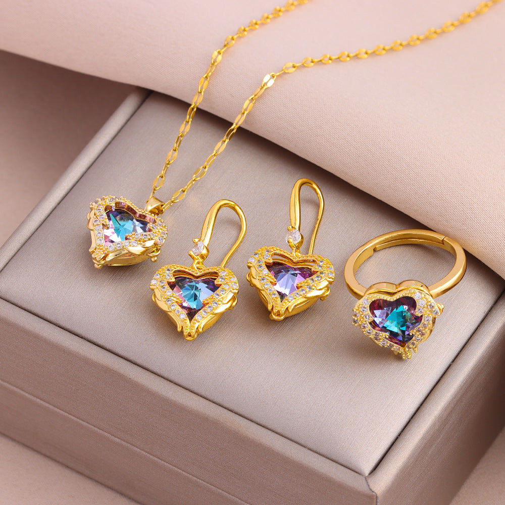 Wholesale Titanium Steel 18K Gold Plating Micro Inlay Colorful Ocean Heart Necklace Earrings Ring Set