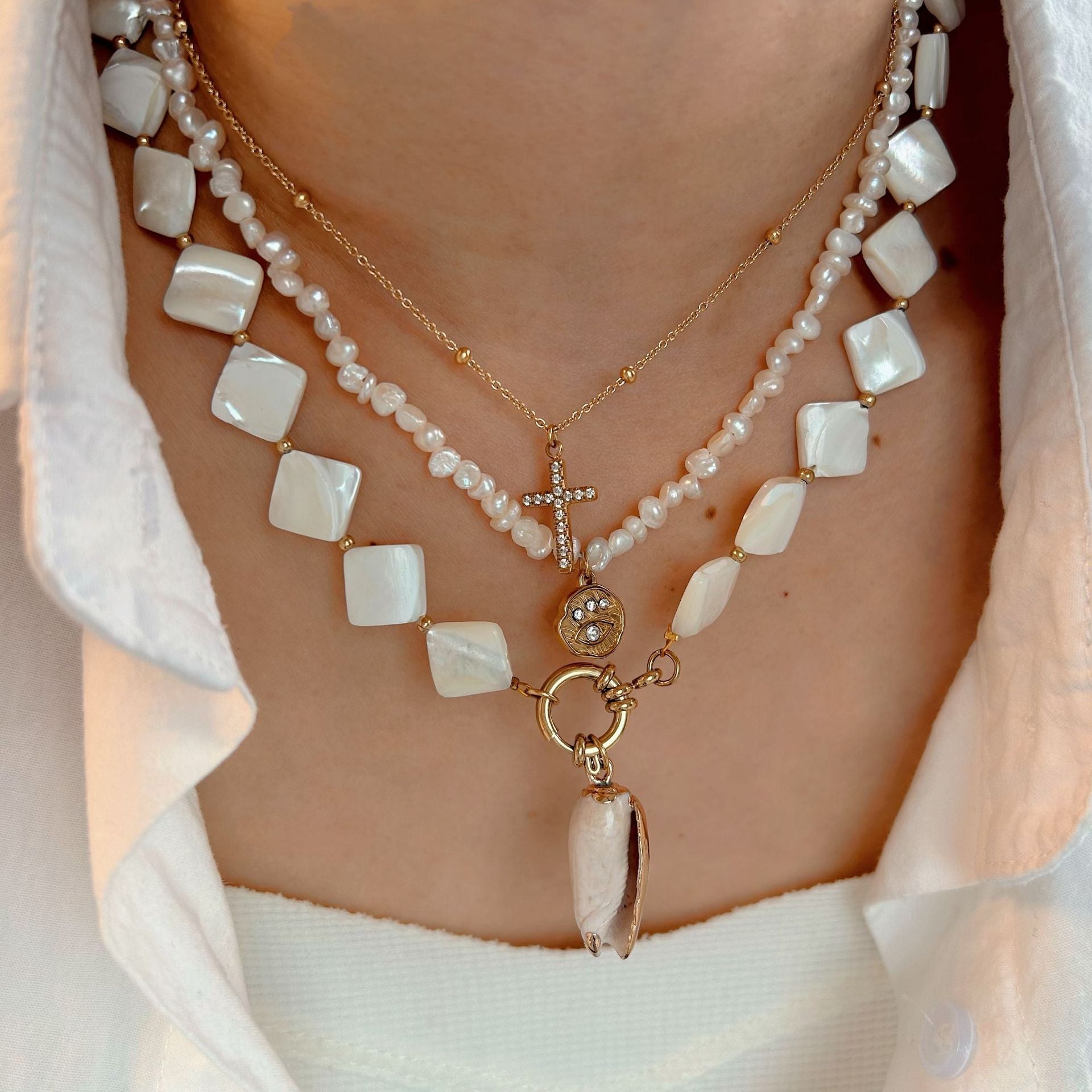 Wholesale Stainless Steel Natural Pearl Beads Beaded Diamond Cross Pendant Necklace