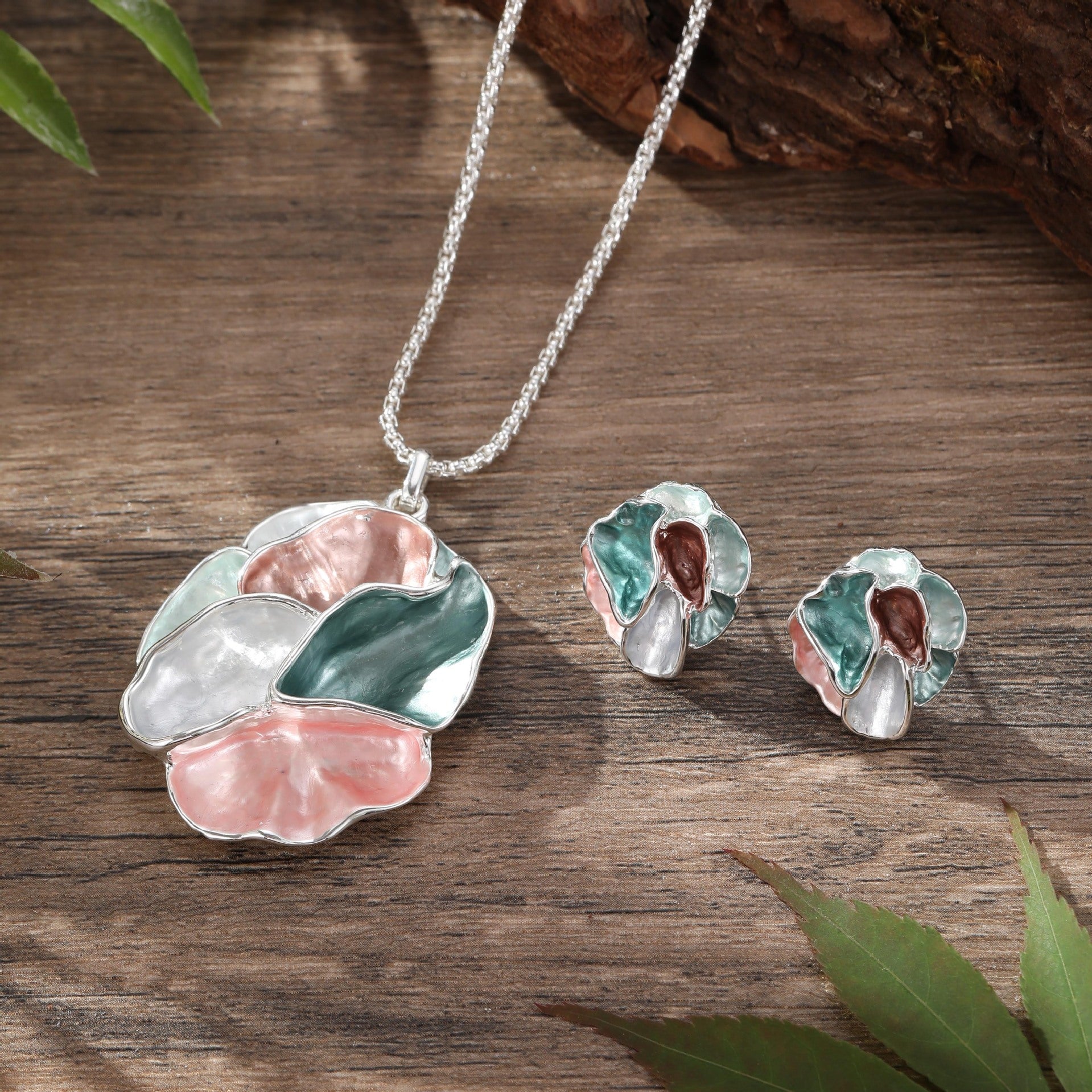 - Pink green geometric petal earrings pendant suit-silver