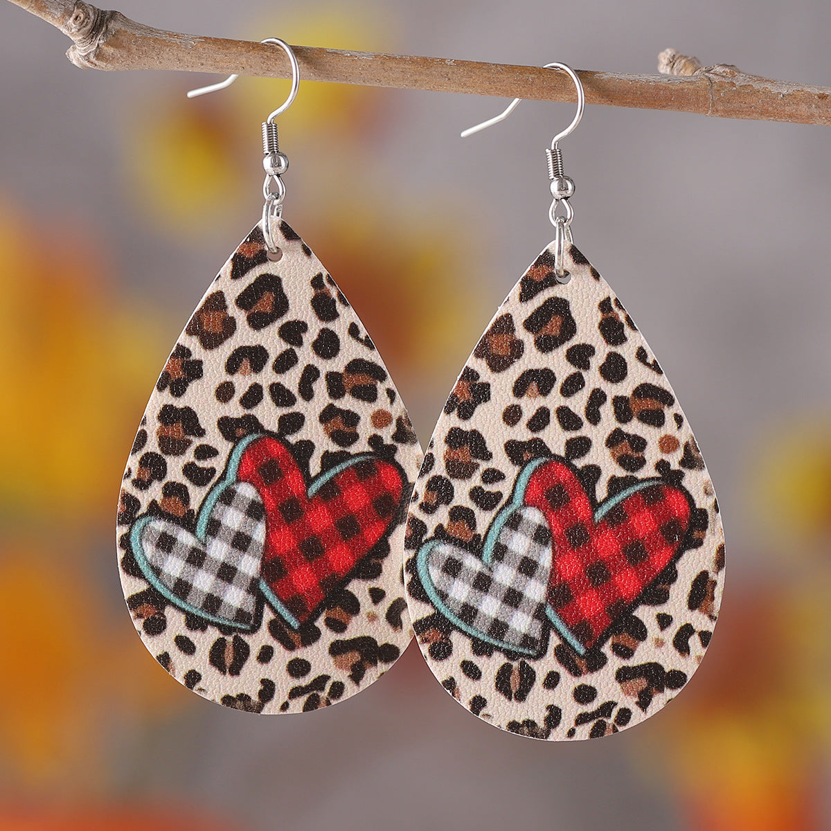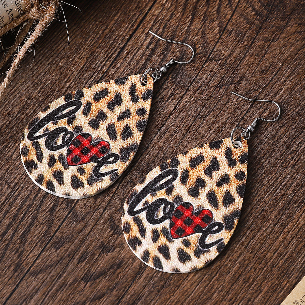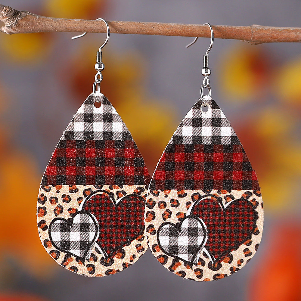 Wholesale PU leather Valentine' s Day earrings with letters leopard print and heart design