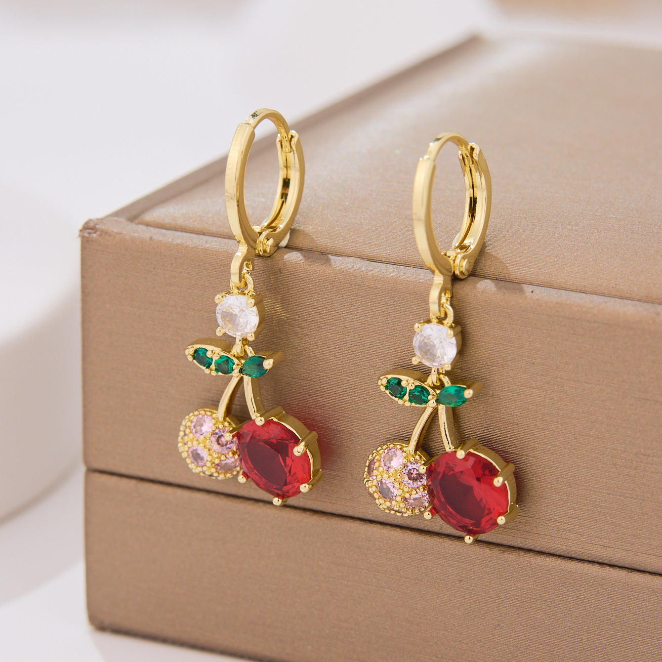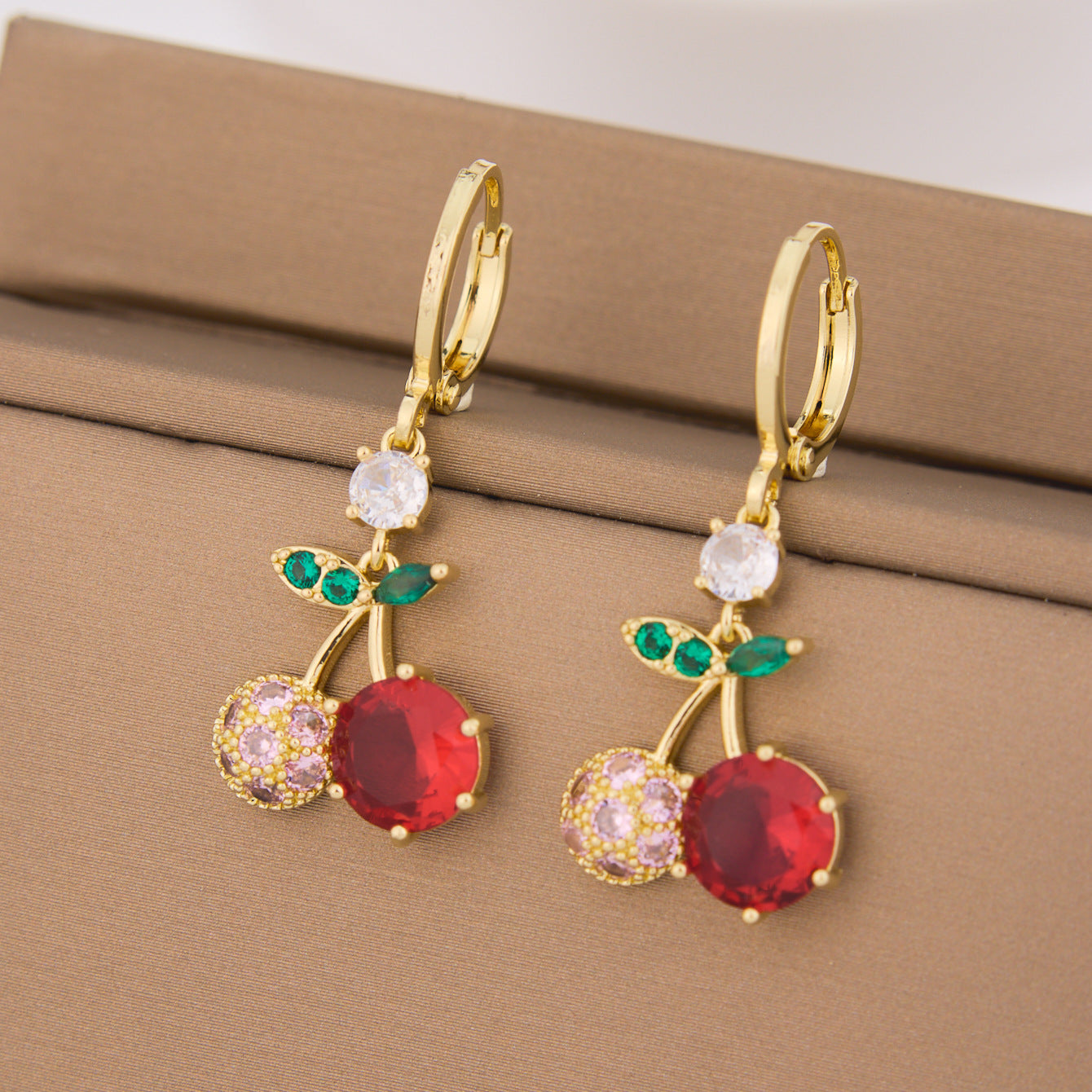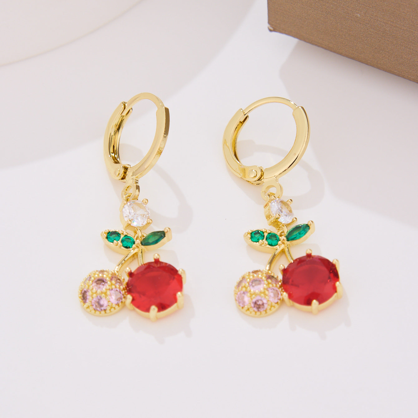 Wholesale diamond-encrusted cherry pendant gold-plated earrings.