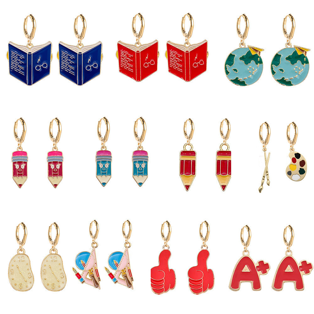 Wholesale Teachers' Day Earrings Pencil Book Clock Alloy Oil Dropping Earrings