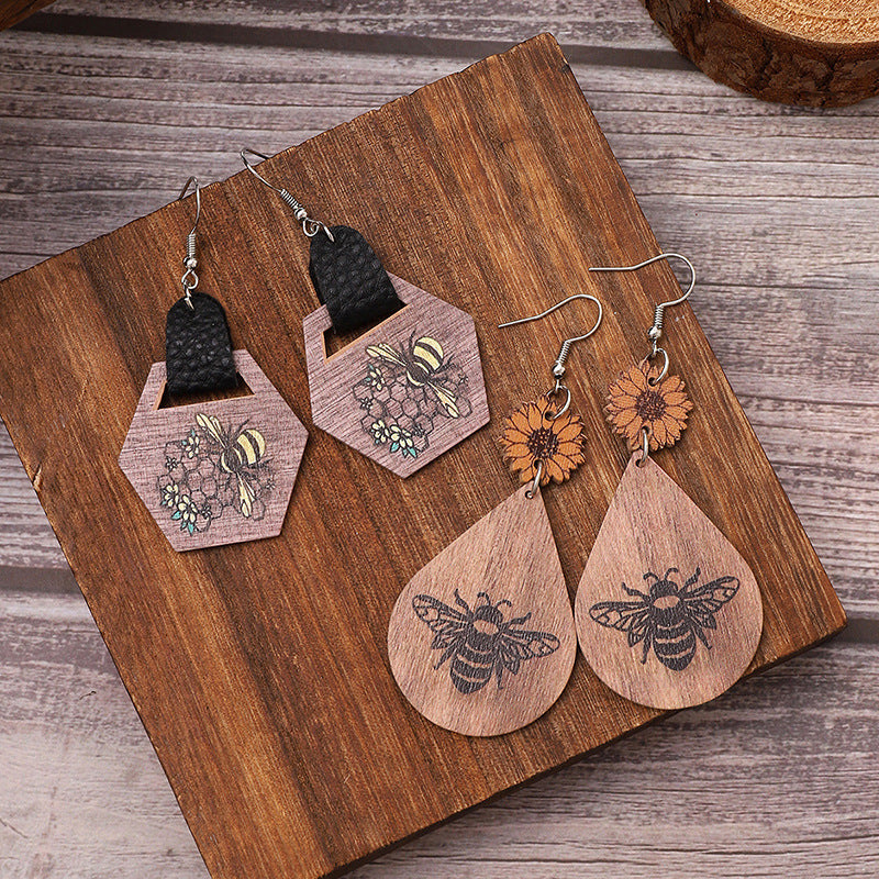 Wholesale Sunflower Bee Pattern Wood Drop Earrings