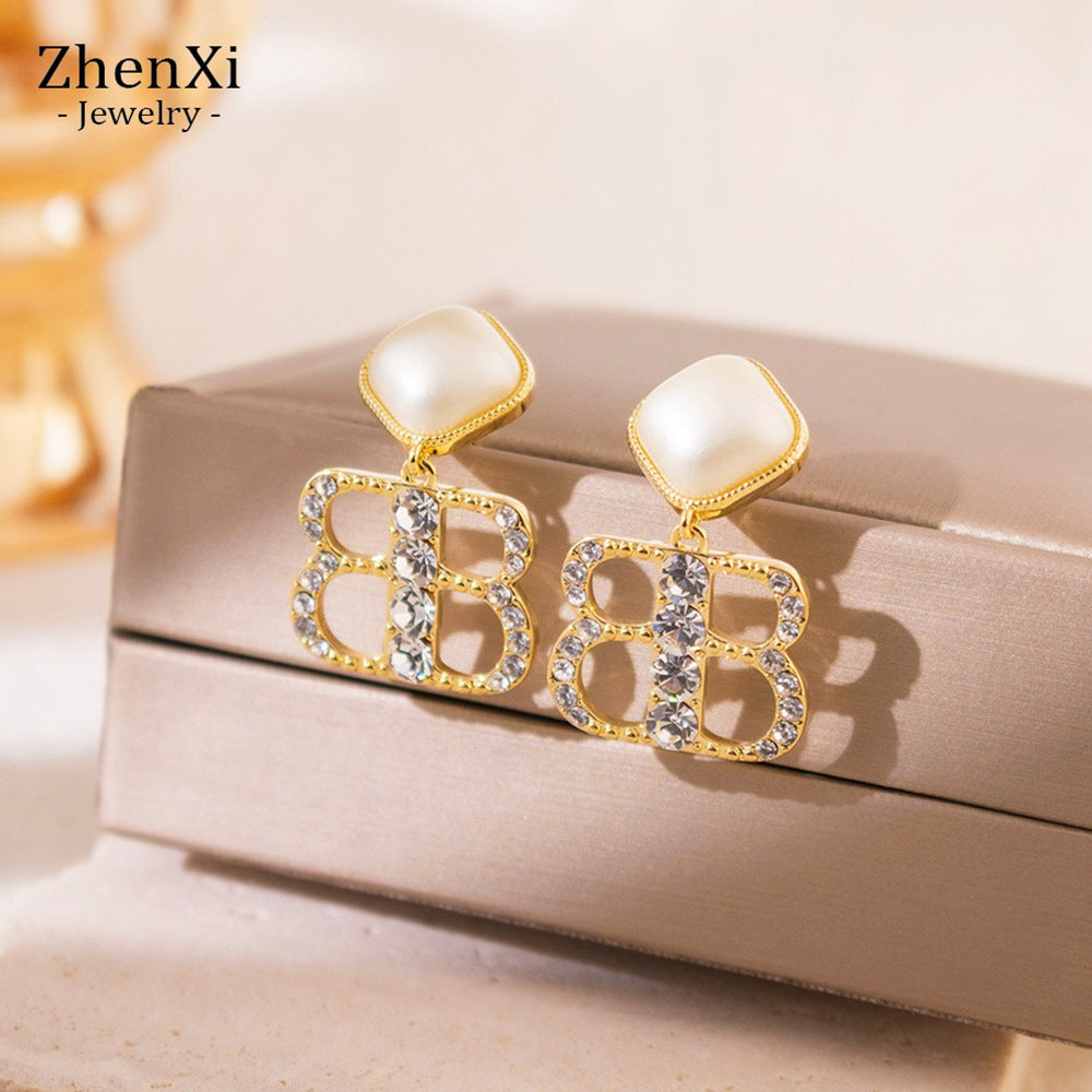 Wholesale Silver Needle French Zircon Letter Pearl Earrings