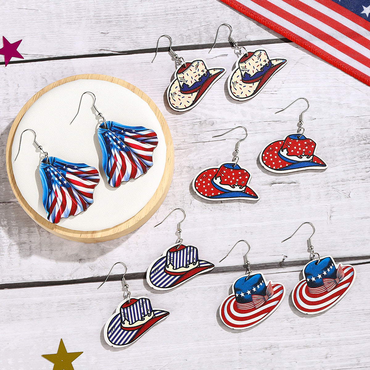 Wholesale US Independence Day Element Wooden Cowboy Hat Earrings