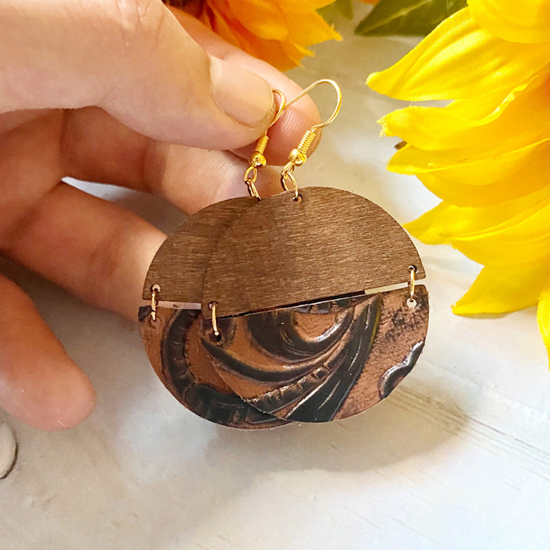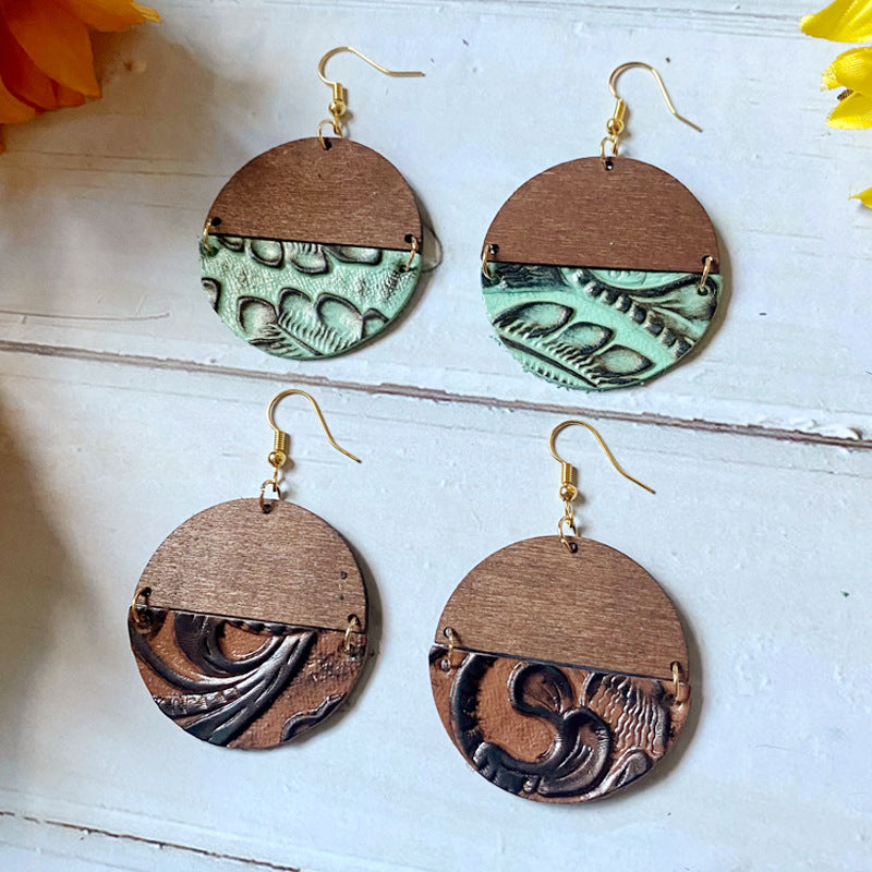 Wholesale Western earrings Wood genuine leather embossed earrings