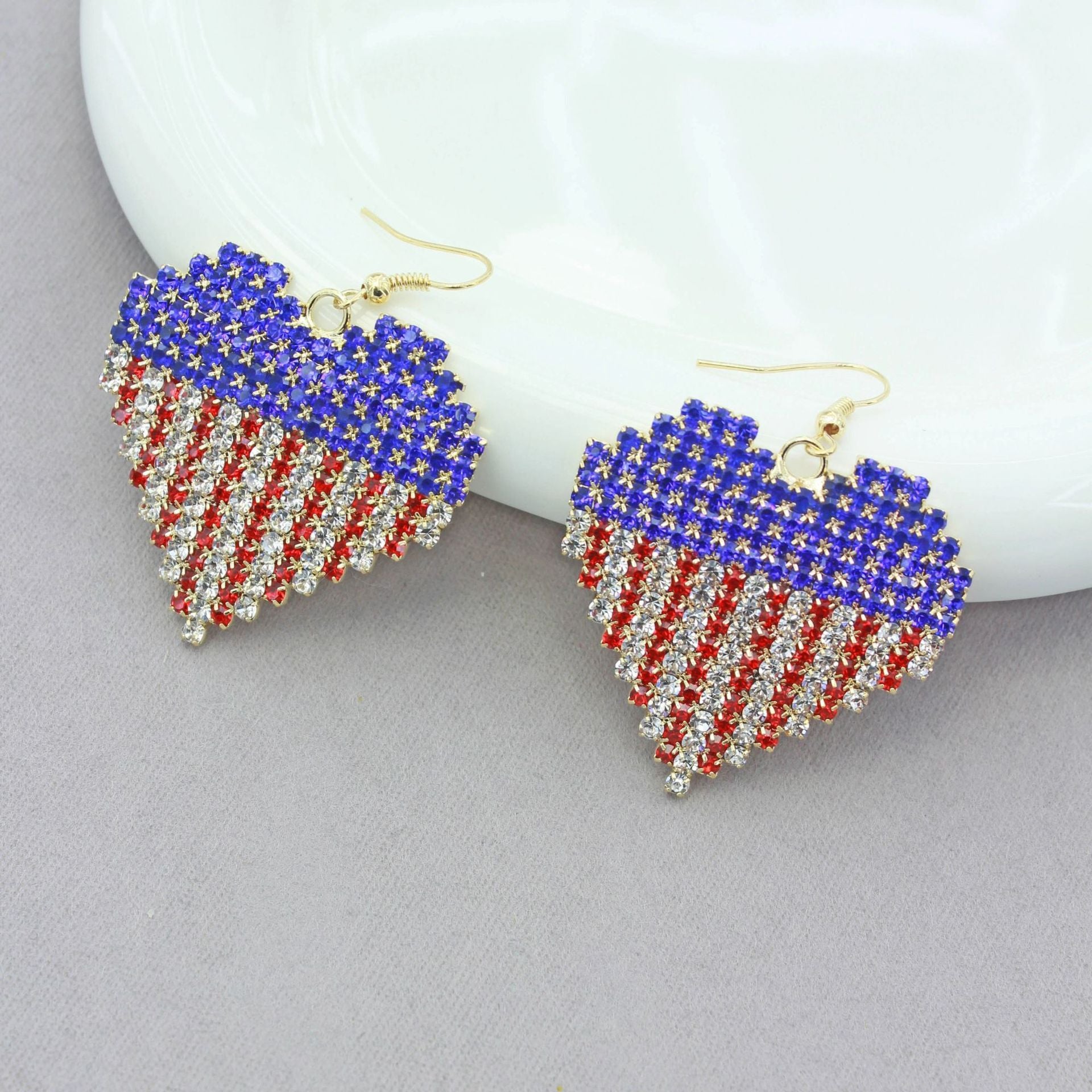 Wholesale flag red and blue striped color rhinestone heart-shaped letter earrings