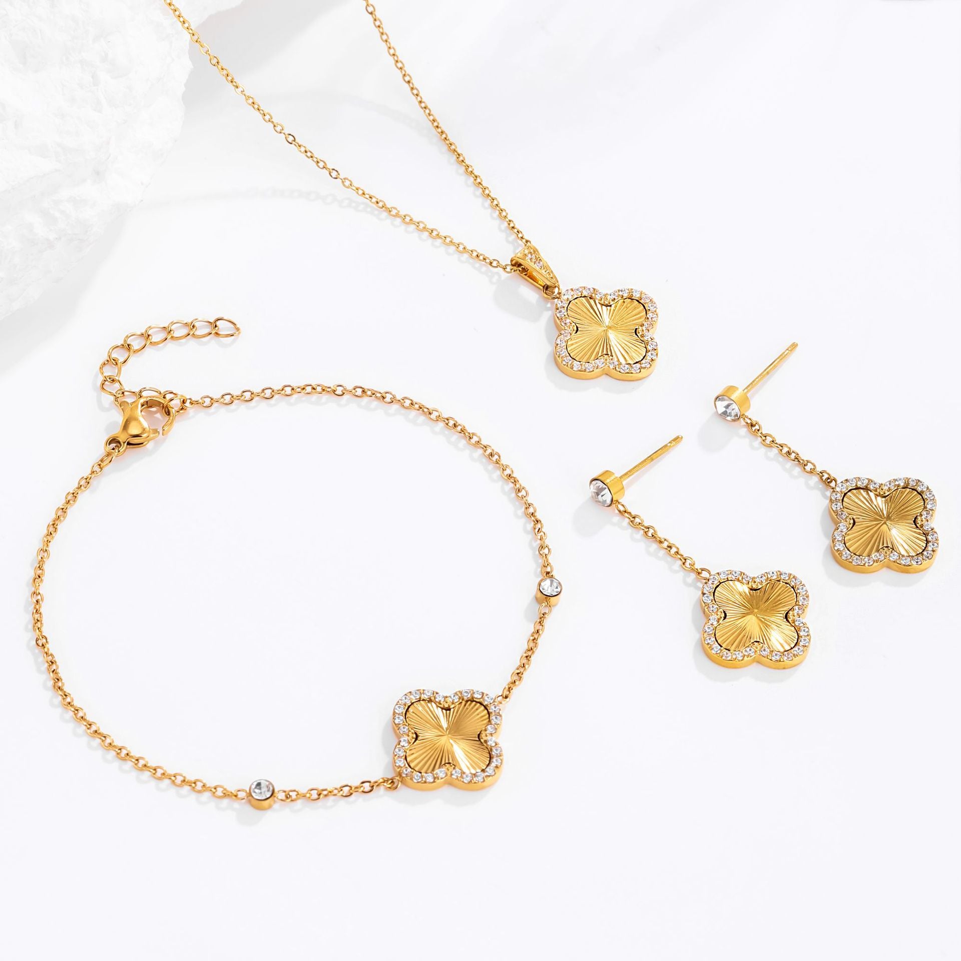 Wholesale Stainless steel zircon-set four-leaf clover necklace earrings, and bracelet set