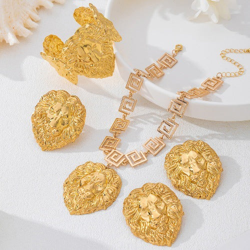 Wholesale Women' s Retro Hip-Hop Lion Head Earrings Necklace Bracelet Ring Four-Piece Set of Personalized Jewelry