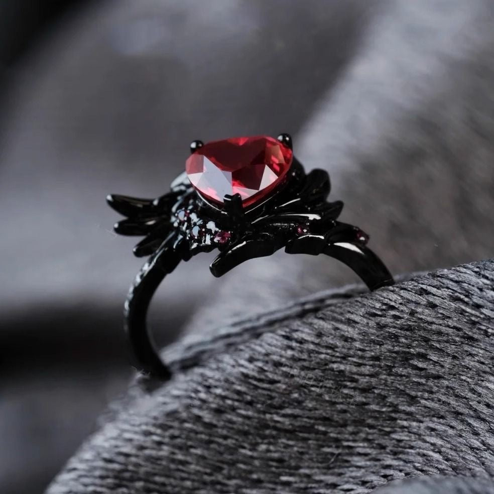 Wholesale Gun Black Wings Feather Inlaid Diamond Red Peach Heart Ring