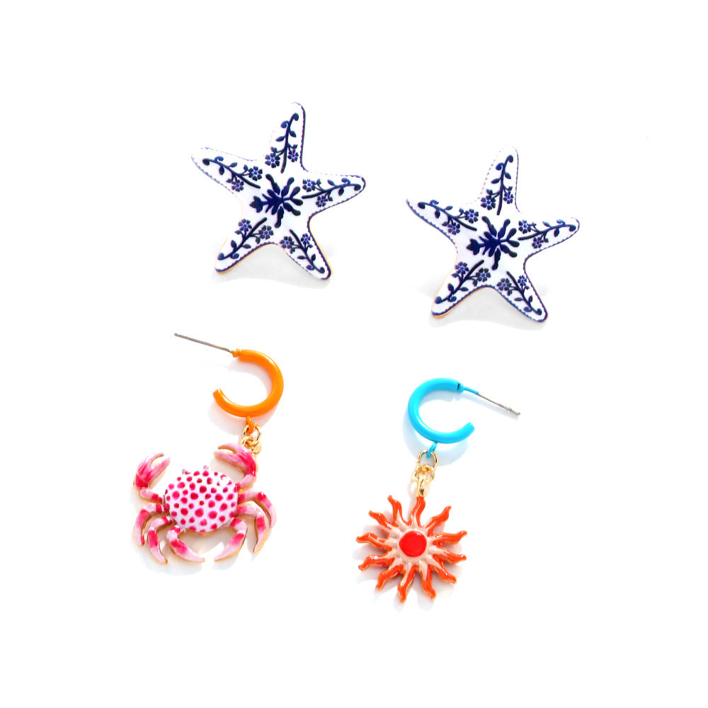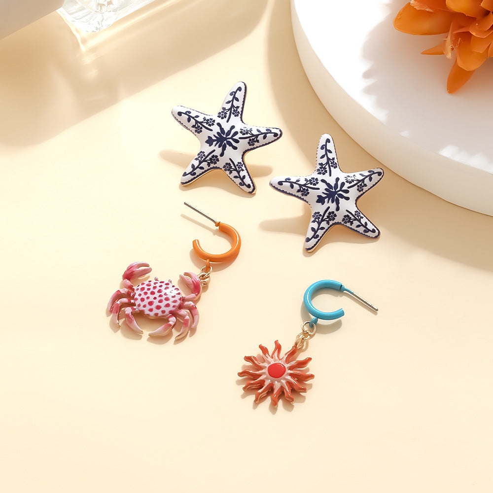 Wholesale Painted Blue and White Porcelain Starfish Crab Sun Earrings