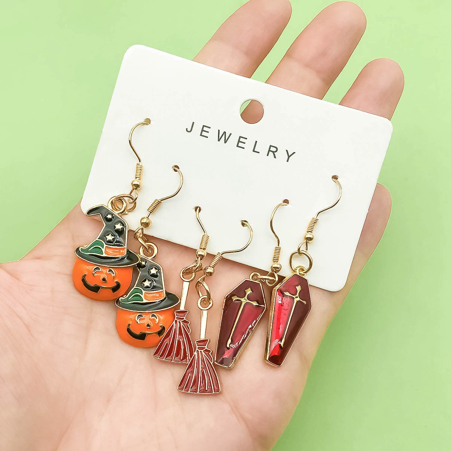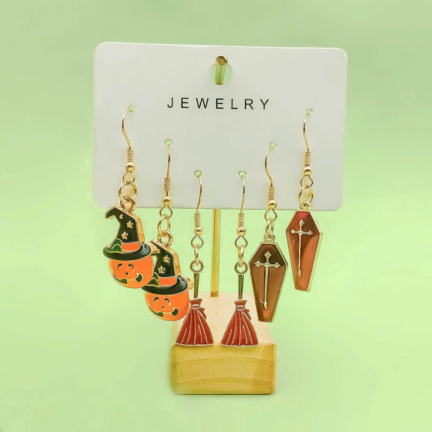 - 3 Pairs of Oil-Drip Coffin Broom Pumpkin Ear Hook Sets - 14. 2g - ER749
