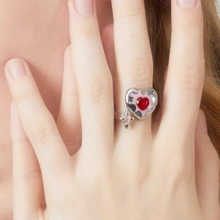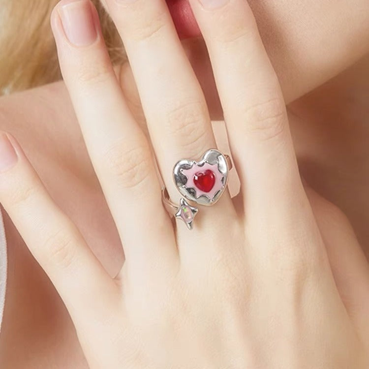 Wholesale Red Heart Diamond Pink Oil Dripping Opening Adjustable Ring