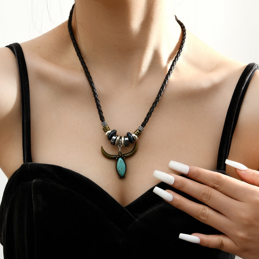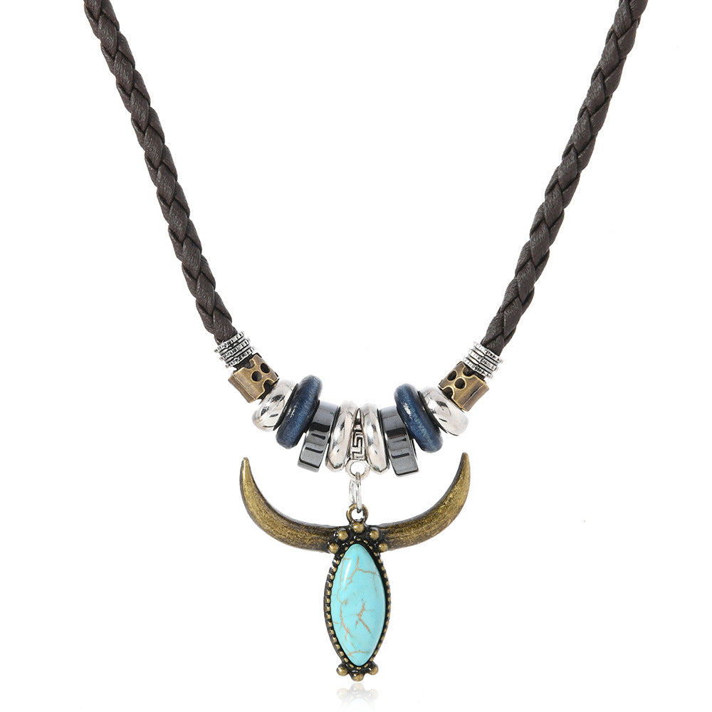 Wholesale Leather Western Cowboy Turquoise Bull Head Necklace