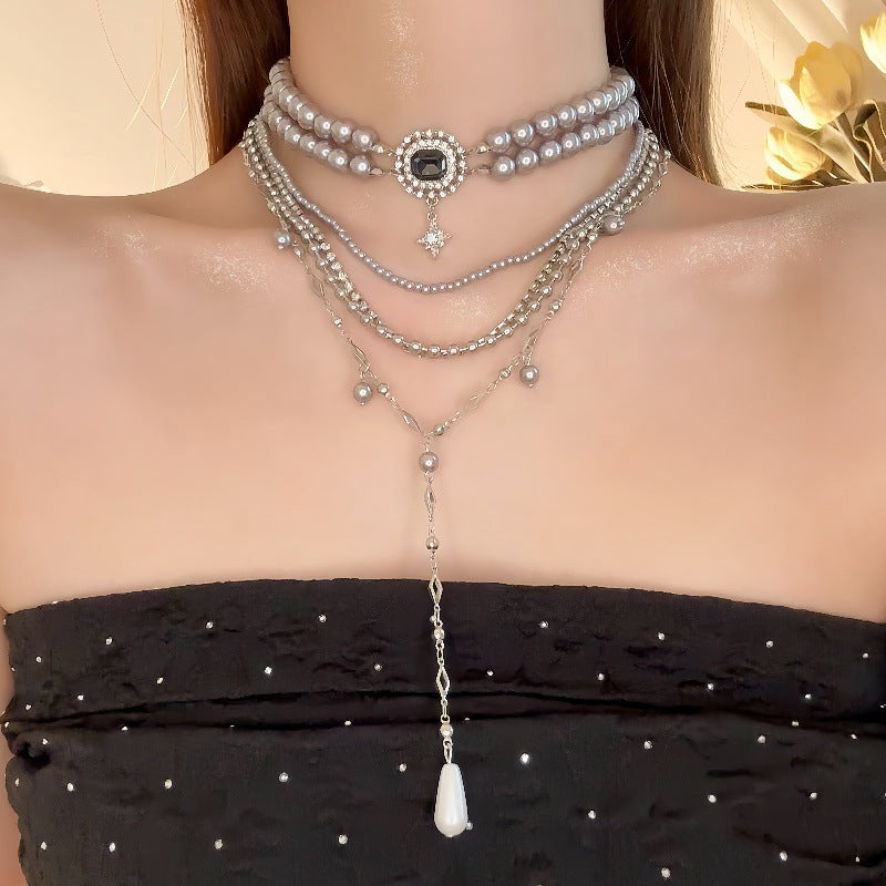 Wholesale Silver Grey Multi-layer Stacked Pearl Necklace