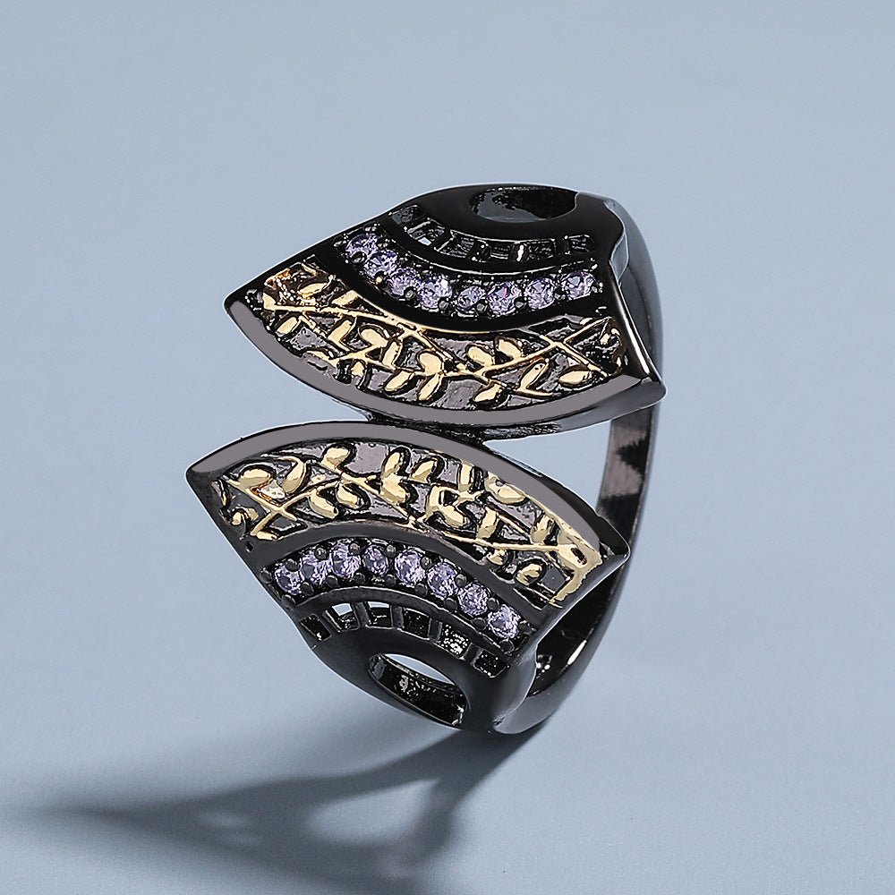 Wholesale black gold two-tone fan-shaped blue zircon ring