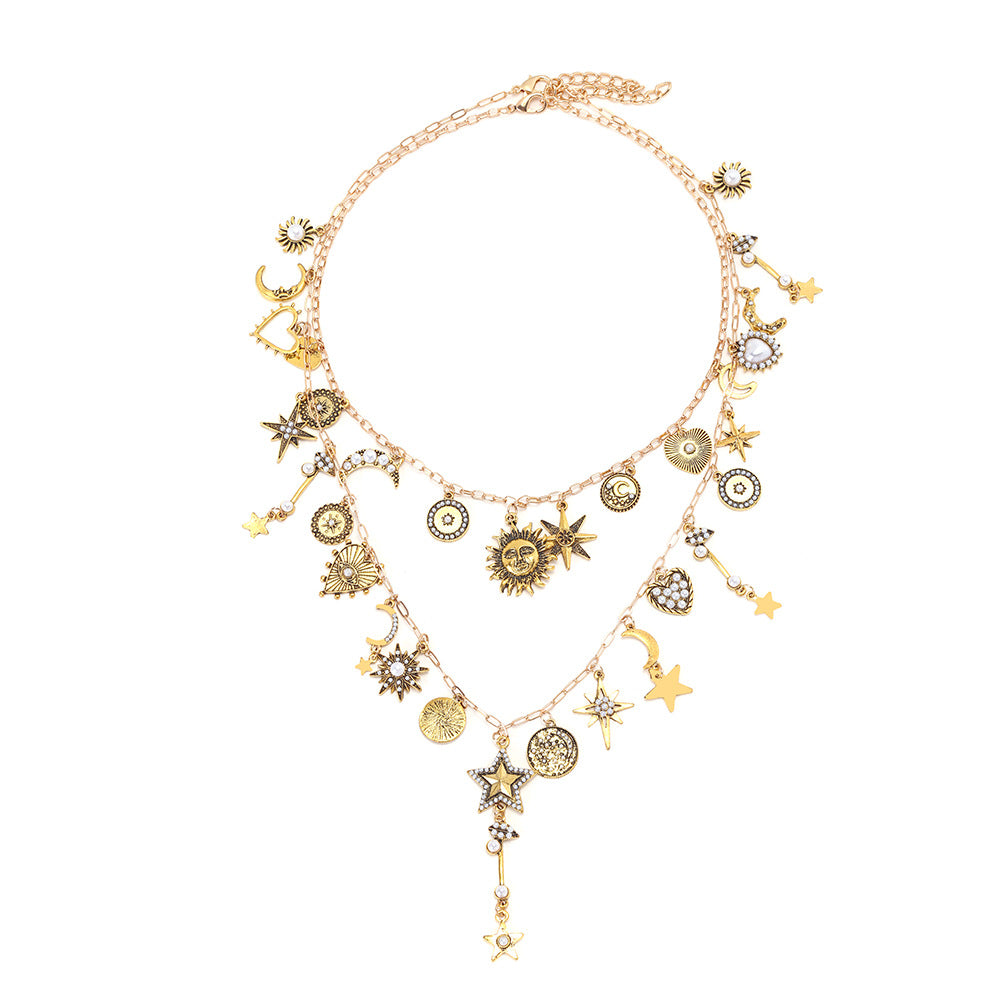 Wholesale Light Luxury Style Hand-Spliced Multi-Layer Sun Star Moon Pendant Necklace