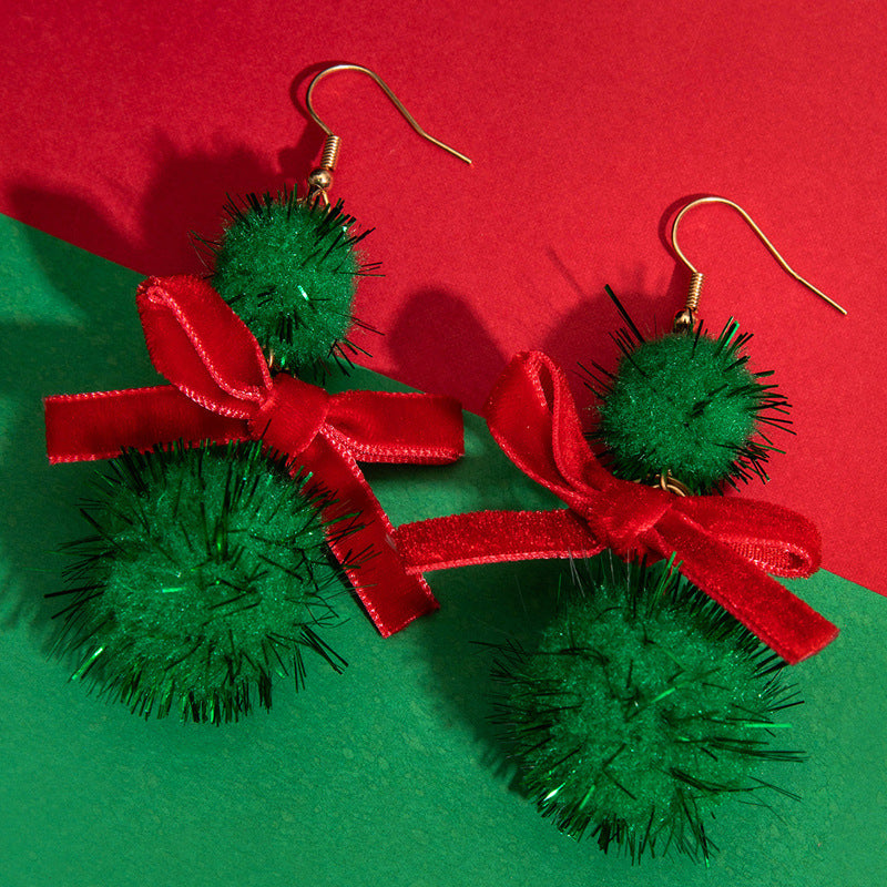 Wholesale Christmas Cute Design Creative Hair Ball Red and Green Bow Earrings