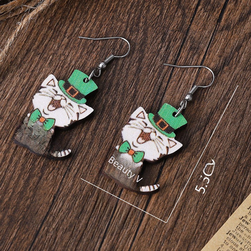 Wholesale St. Patrick's Day green hat cat double-sided wooden earrings