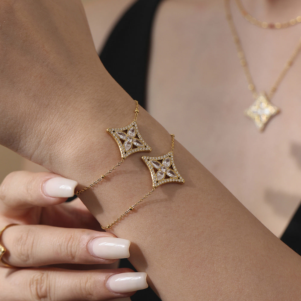 Wholesale Stainless steel Zircon Rhombus Flower Full Diamond Necklace Bracelet Ring Set