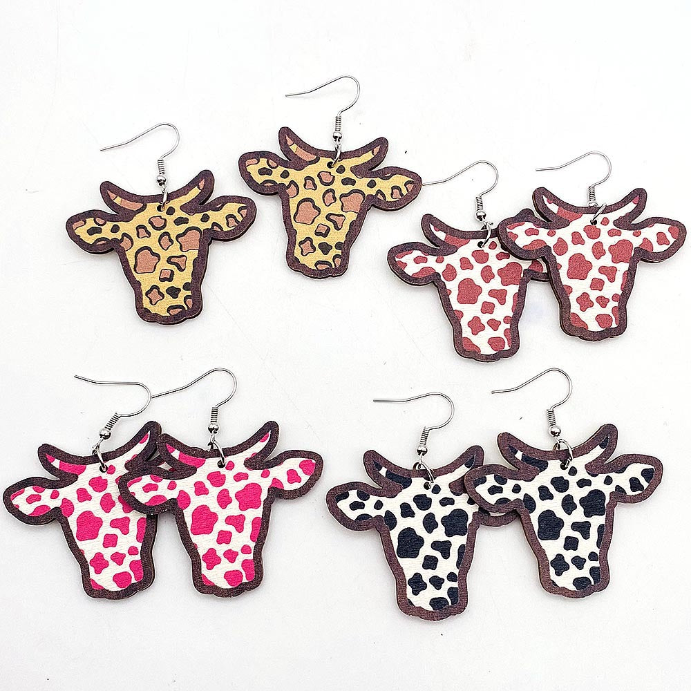 Wholesale Wooden Western Cowboy-Style Leopard Print Bull Skull Earrings