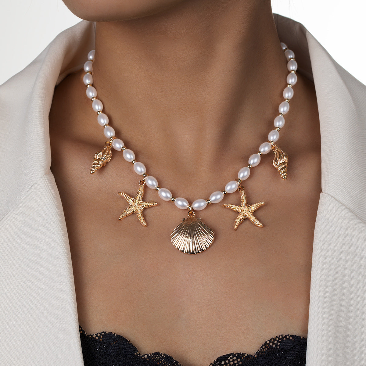 Wholesale Bohemian Alloy Starfish Conch Shell Pendant Pearl Gold Beads Beaded Adjustable Necklace