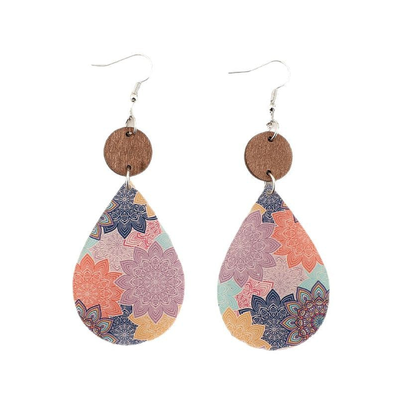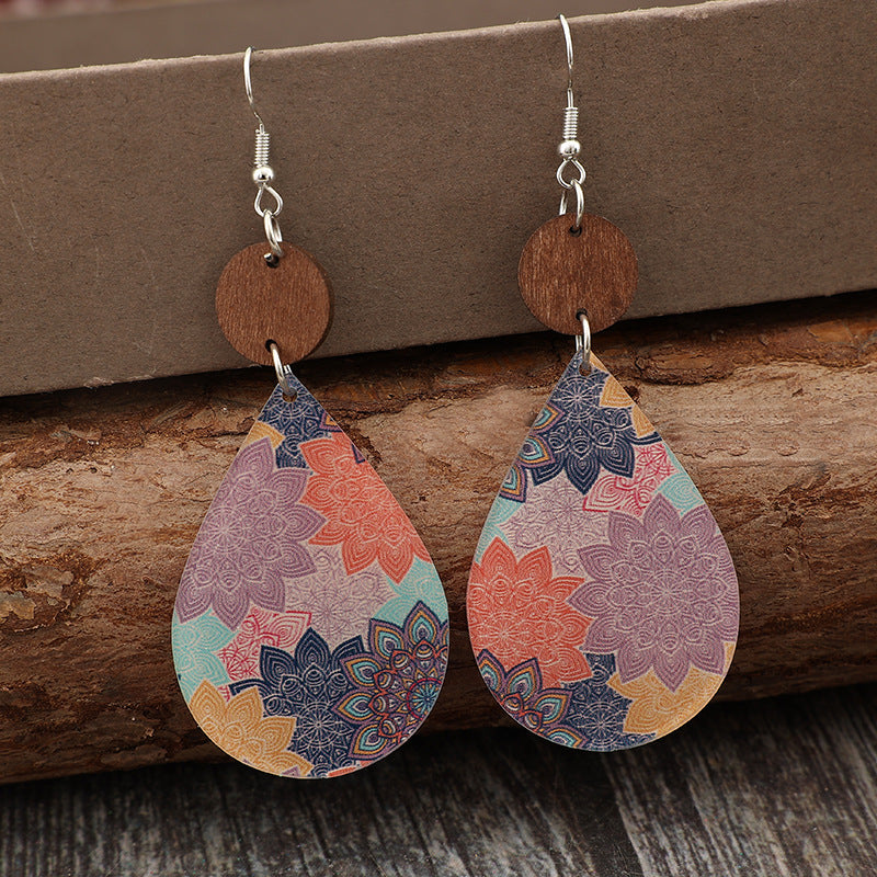 Wholesale Bohemian Drop-Shaped Printed Flower Acrylic Spliced Wood Chip Retro Earrings