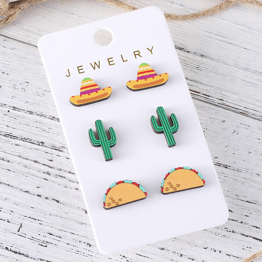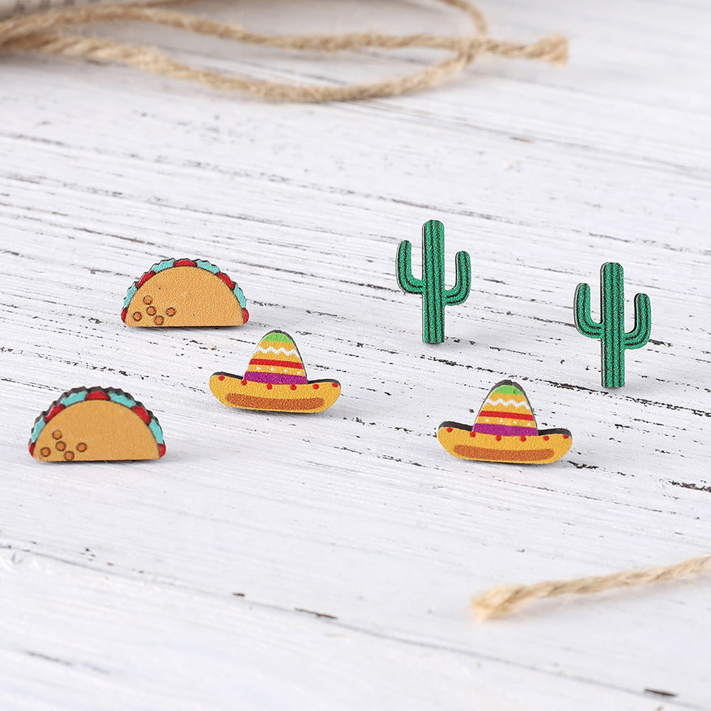 Wholesale Colorful Straw Hat Cactus Wooden Earring Set