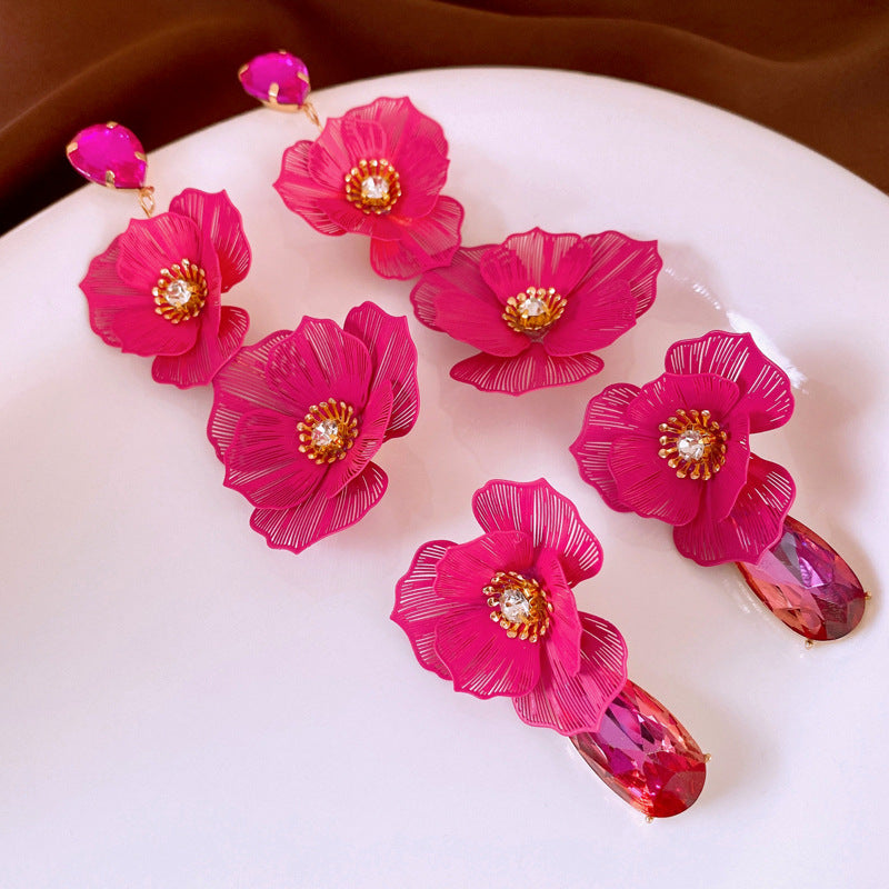 - Steel Needle-Rose Red Flower Drop Earrings