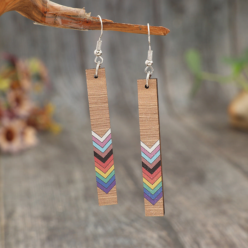 Wholesale Geometric Rectangular Printed Rainbow Pattern Wooden Moon Retro Earrings