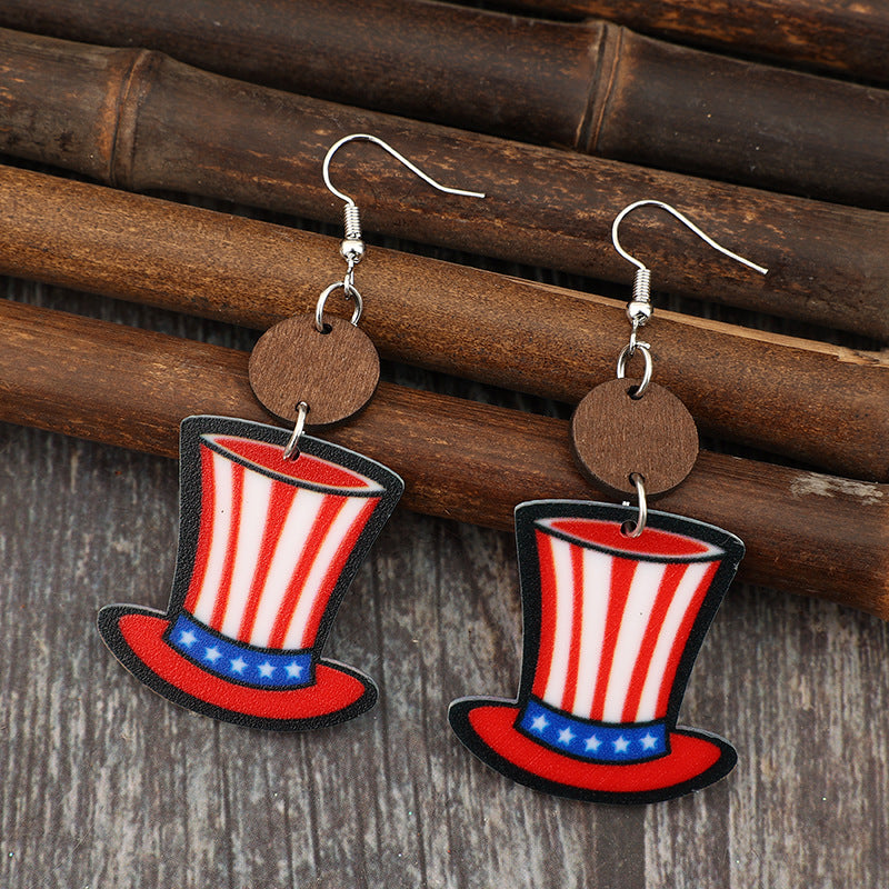 Wholesale Magic Hat Printed US Flag Acrylic Splicing Wood Pieces Independence Day Earrings