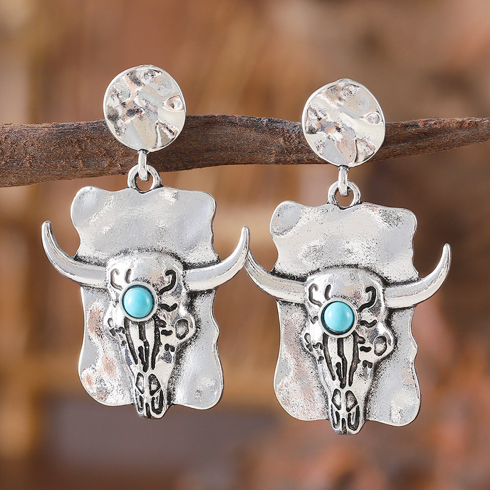 Wholesale retro ethnic style inlaid turquoise cow head earrings